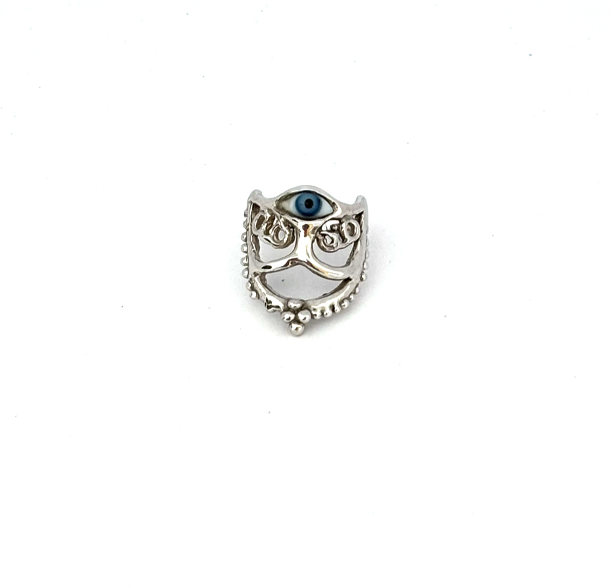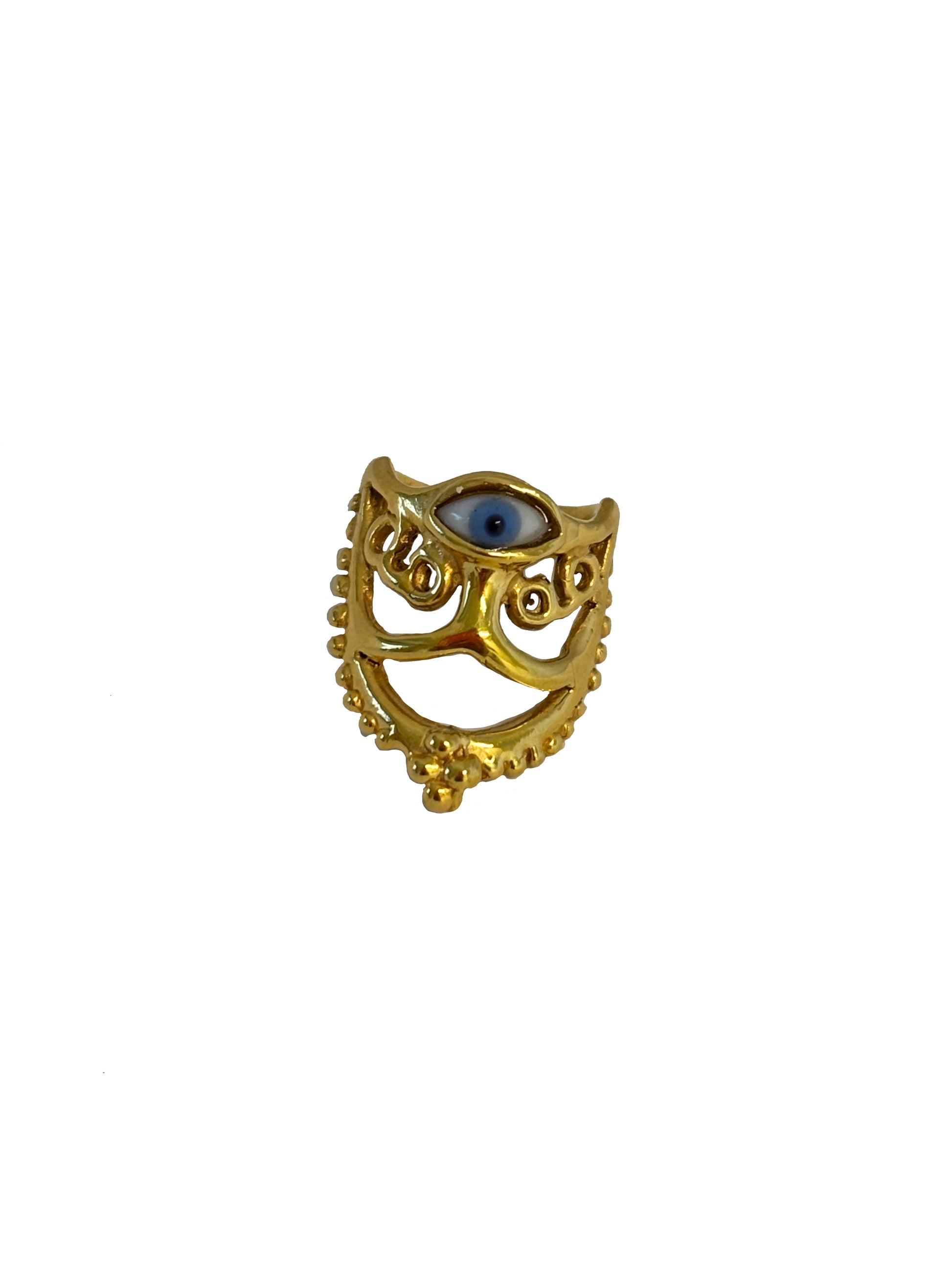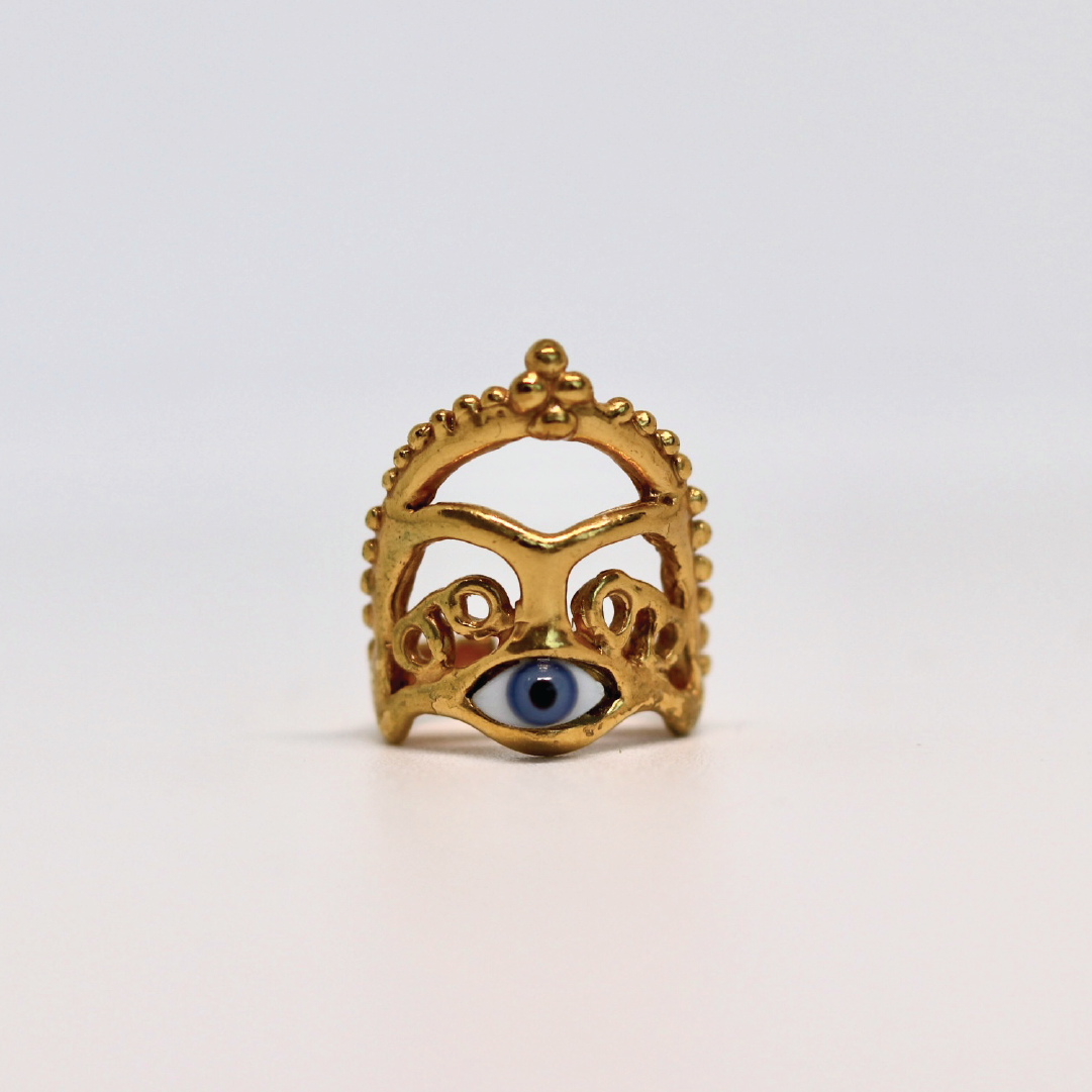In Turkish culture, it is believed that the evil eye protects one from “nazar.” This piece reflects our take on the evil eye, placed on a beautifully detailed ring.